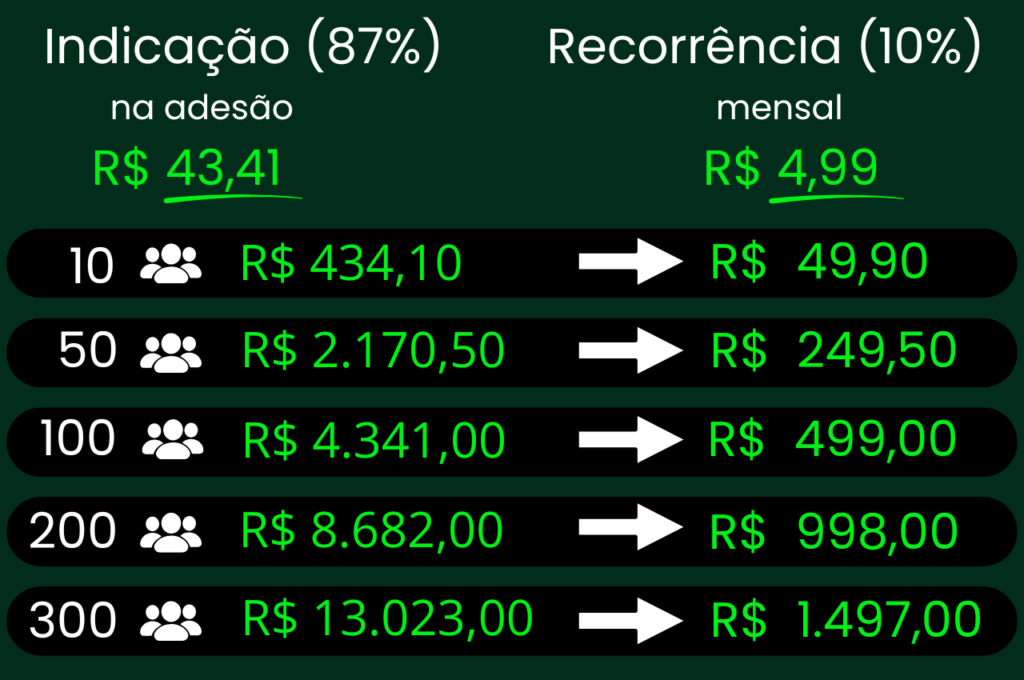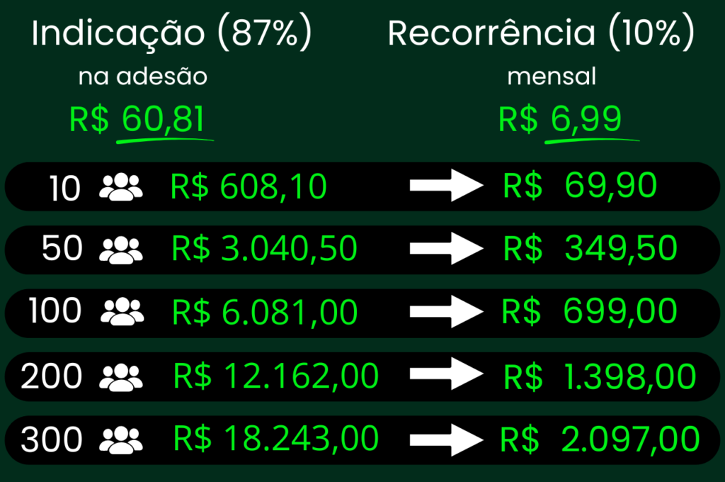 Toda vez que você indica um amigo para a Federal Associados você recebe 87% de comissão sobre pacote que o seu indicado escolheu, e todo mês quando seu indicado pagar a mensalidade você recebe um bônus mensal recorrente que varia de 10 a 20%, ficando assim: