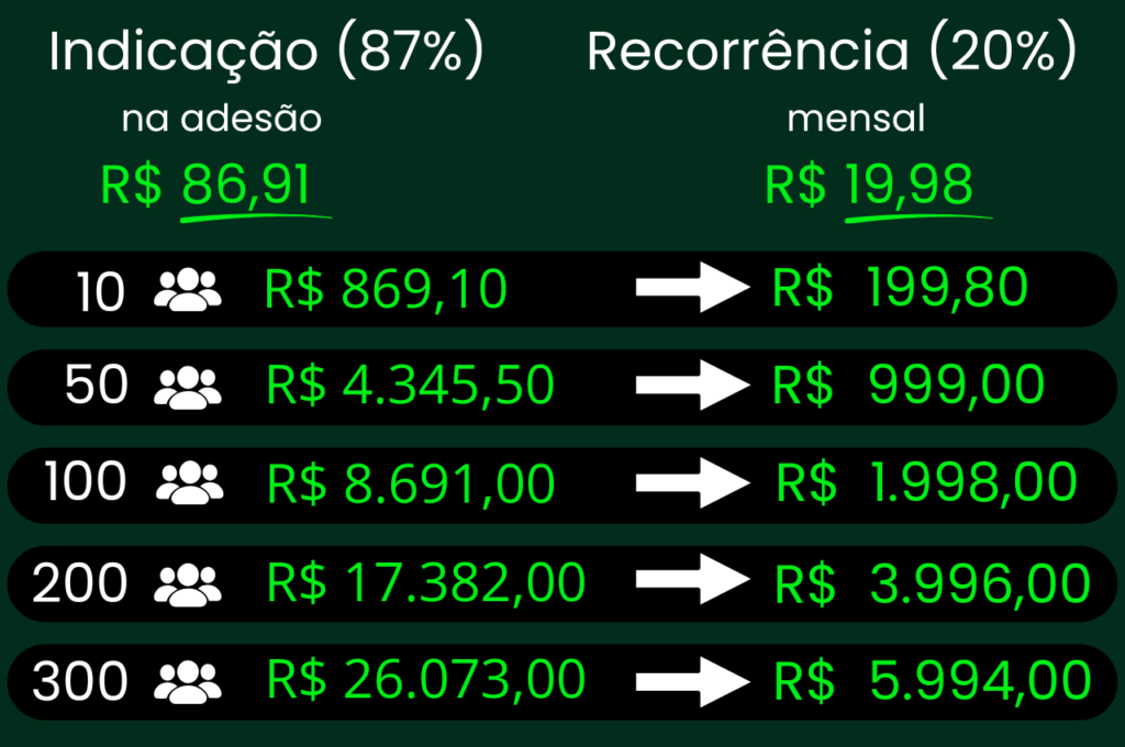 20% de comissão recorrente nos pacotes a partir de R$ 99,90.